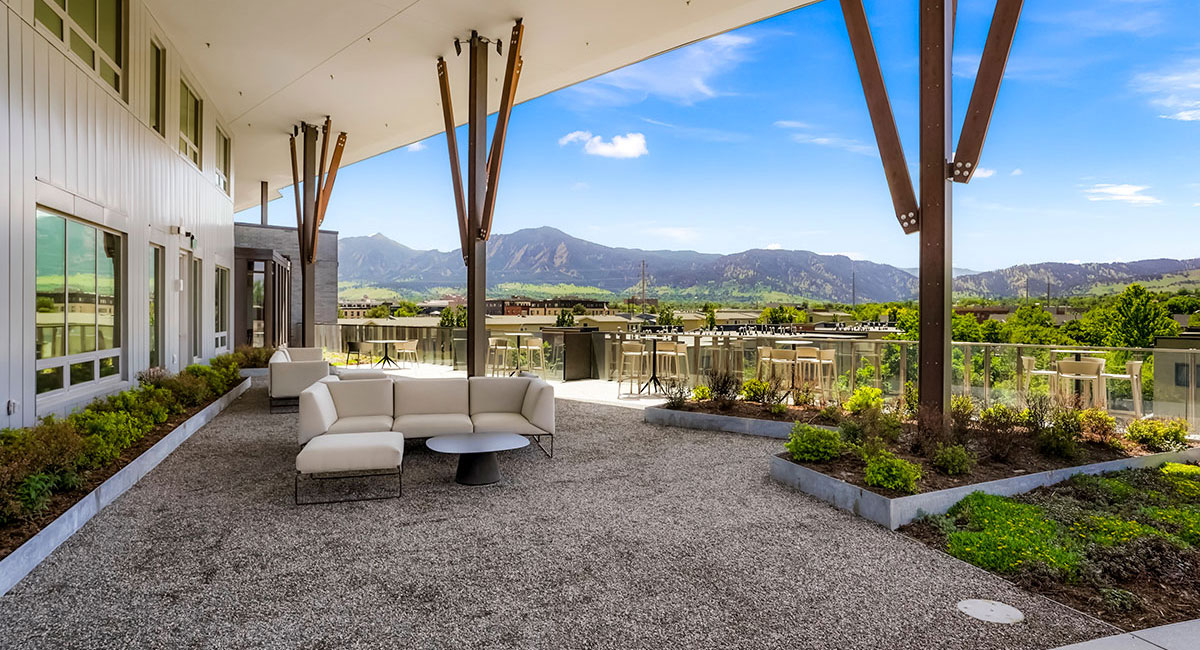 The wood-framed apartment building includes a community patio for summertime grilling and a courtyard. The office building has a steel frame core with a dramatic 7,000 SF cantilevered deck facing west to Boulder’s iconic Flatiron mountains. The exterior skin includes masonry, metal panel, glazing, stucco finishes, and photovoltaic panels. Benefitting from Colorado’s plentiful sunshine, the apartments offer near floor-to-ceiling windows.