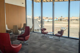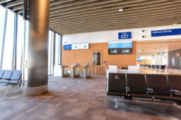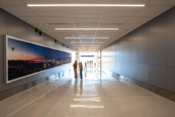 The two-story, eight-gate complex has an L-shaped footprint directly connecting to the passenger concourse of the West Gates on its second floor. A signature element of the design is an array of aluminum sunshades that are echoed throughout the passenger concourse interior.