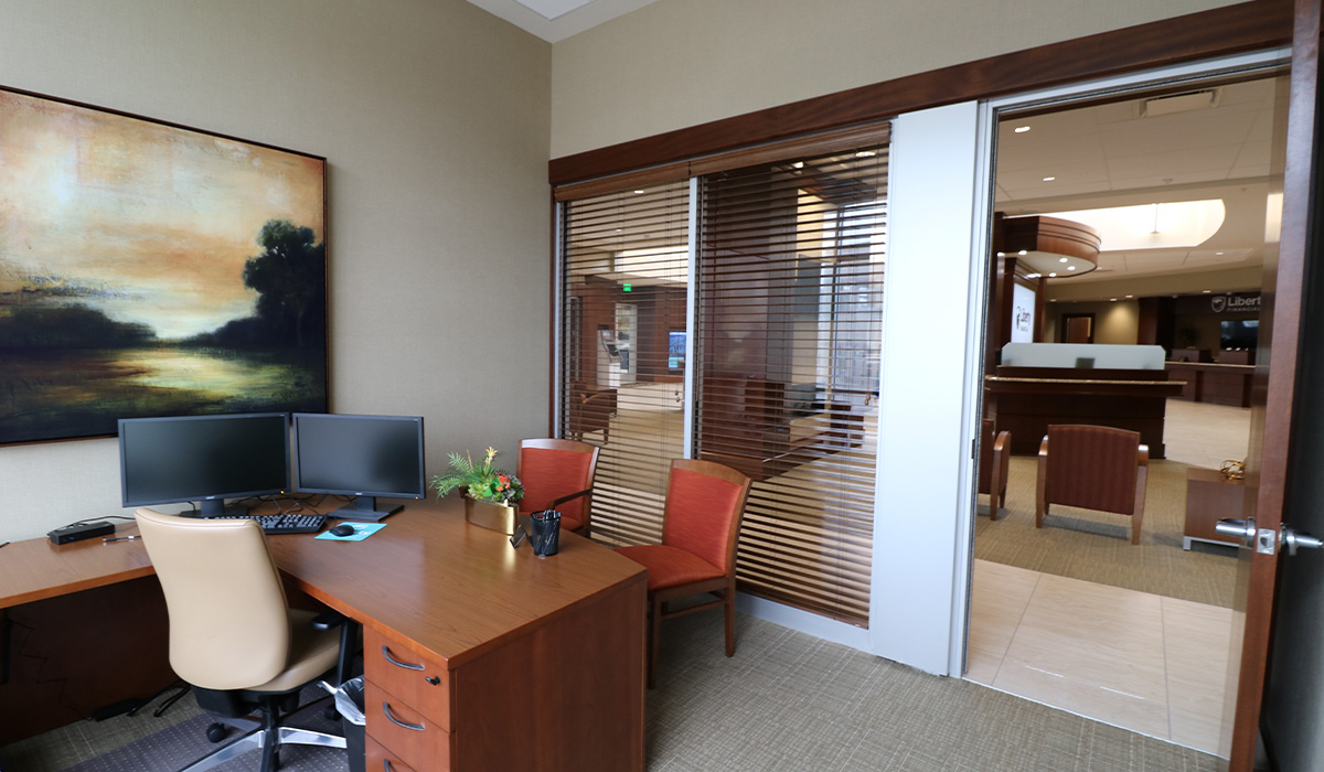 The scope of work included a spacious lobby and guest waiting area, fourteen perimeter offices, three conference rooms, a structural vault, bank teller station, dual drive-through with four teller stations, an ATM, and a large open employee workstation area complete with a lounge and a double-sided fireplace.
