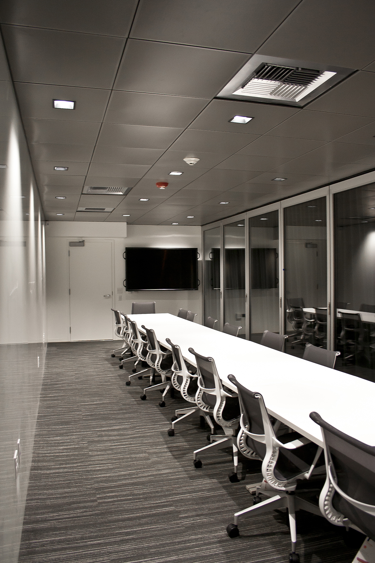 The ceiling of the entry lobby was removed to create an open entry where a media wall was constructed, an immediate focal point upon entering the building. The renovated lobby is considered the technological nexus of the entire building – with an invention described as a digital post-it wall. It’s a gently folded plane of slumped glass panels, subtly textured, sandwiching a layer of vinyl printed graphic patterns, backlit, with eight video monitors mounted behind the glass on which students can post their digital content.