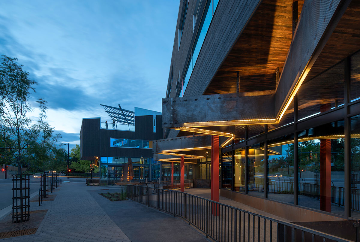Inspired by mountain sheds and railroad cars, the building’s design features weathered wood and windows, reflecting both urban and natural contexts. Windows shift from vertical to horizontal, and inset meeting/event decks are positioned to take advantage of Flatiron Mountain views. The structure has a standing-seam galvanized roof that slopes to preserve neighbors’ views.