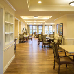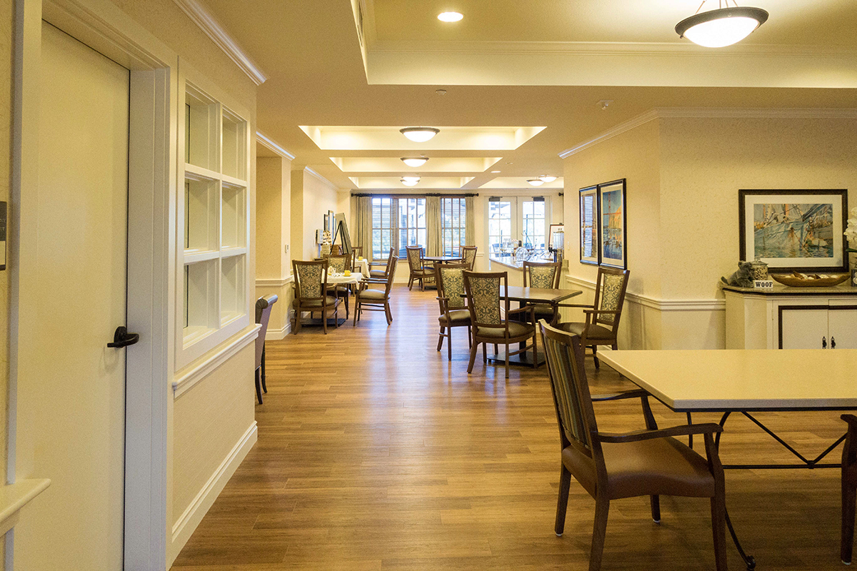 Featured amenities include a dining room on the first level and a private dining area, and levels three and four each have warming kitchens. Community living rooms, media rooms, and card rooms provide active regions for the residents.