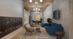 The Economist’s modern lobby with fireplace, tables, and cozy chairs, providing enticing social/communal workspace. Creative social spaces include a modern covered rooftop entertainment space, with a 14” post-tensioned podium concrete slab on the second floor. The patio provides residents with stunning views of the city and the Rocky Mountains.